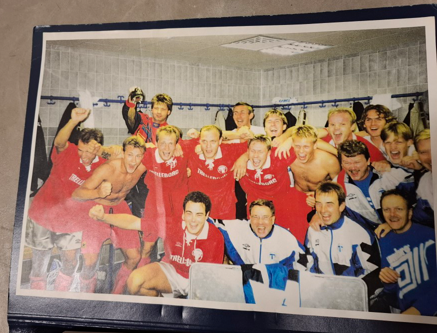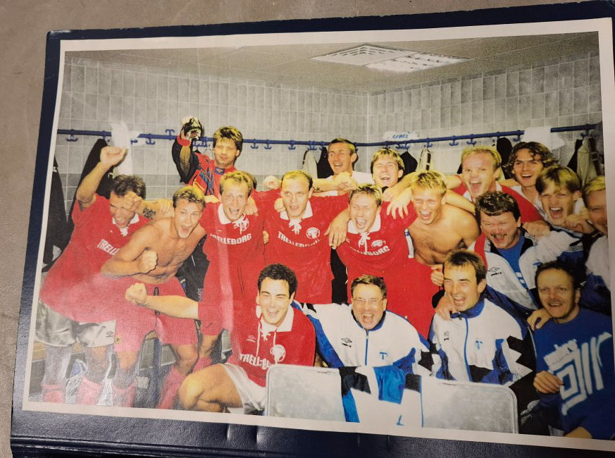 När matchklockan tickar upp mot minut 94 blåser domare Strampe av matchen och den första delen av två har gått till Trelleborgs FF. Fredrik Sandell beskriver en stor glädje i omklädningsrummet och nämner också att han tror att någon tog en bild på firandet. Det visar sig att det var med Jonas Brorssons kamera som bilden togs och den kan ni se här nedanför.