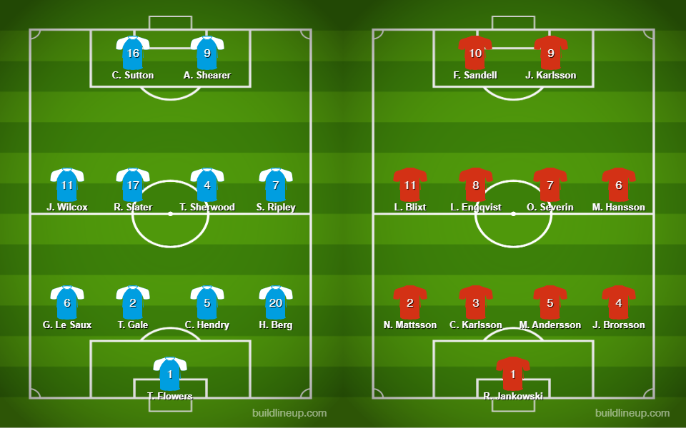 När klockan slog 21:00 den 13 september 1994 blåste domare Hartmut Strampe från Tyskland igång matchen och startelvorna har du på bilden här nedanför.